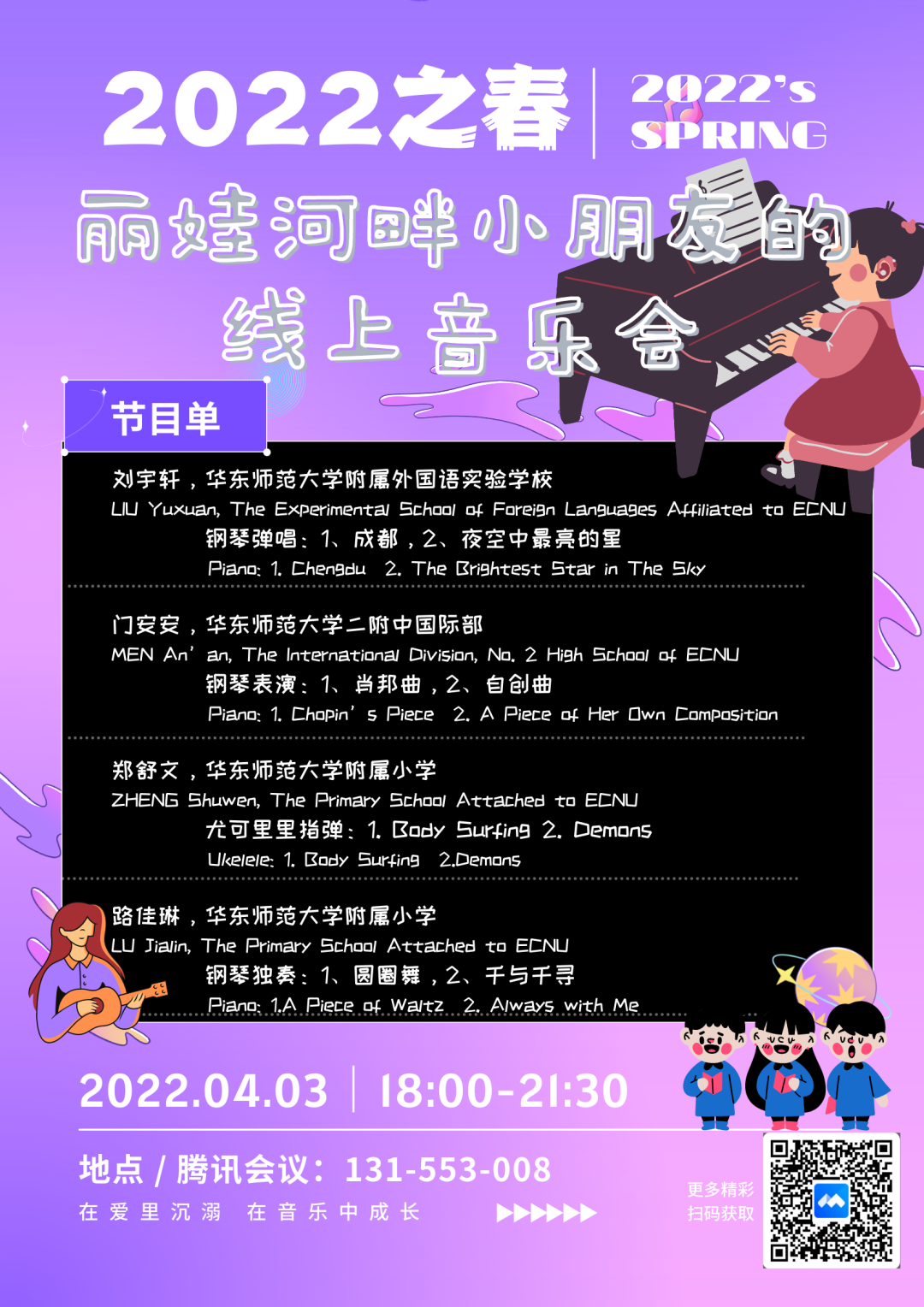3月以来,因疫情校园实行封闭管理。为丰富同学们的课余生活,缓解红桃视频 师生疫情期的心理压力,4月3日晚,红桃视频 在线上举办“2022之春 丽娃河畔小朋友的线上音乐会”。值此疫情防控特殊时期,学院老师的孩子们通过展示自己的音乐才艺,将信心和希望传递给每一位师生,将全院师生携手战疫、共克时艰的决心和信心紧紧联系起来。本次线上音乐会由胡泽艺同学主持。