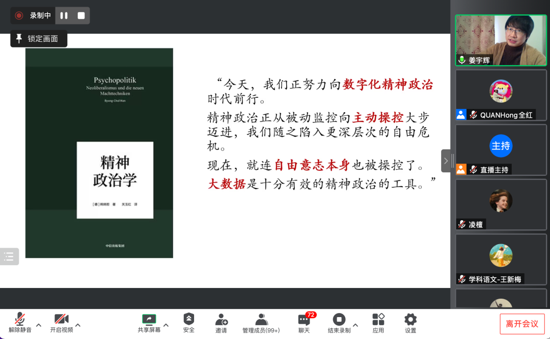 讲座最后,姜教授直言,游戏政治学的核心主题并非仅仅是人与机器、人与技术的共生关系,更是要反思数字技术对人类主体日益加深的、难以挣脱的控制。而如何重获自律、警惕数字技术的控制、如何反制数字技术以及重新激活沉思的积极生活也成为我们应该深入思考的问题。