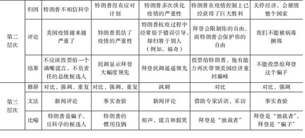 内容分析法与话语分析法用于对上述材料进行分析。内容分析法主要用于分析材料中的主题、主角、态度等可量化总结的变量。话语分析法主要用于挖掘框架元素(frame elements)及意义阐释。根据恩特曼的定义,框架由问题的定义(Problem definition)、因果解释(Causal attribution)、道德评判(Moral evaluation)以及方案(Treatment)四个元素组成。 我们通过话语分析法挖掘以上框架元素,并对比两位候选人及其所处党派政治精英的不同话语框架。媒体框架的分析有别于政治话语的框架分析。在结合恩特曼、甘姆森等人的研究后, 媒体话语的框架结构划分为三个层次,即包含新闻的主旨的第一层次;包含新闻的主要事件、语境、归因、评论以及结果的第二层次;以及包含新闻中所运用的修辞手法、文法组织以及比喻等微观层面的第三层次。换句话说,在两位候选人政治话语的框架分析的基础上,我们结合新闻报道的特征,加入对新闻主旨、新闻事件、新闻评论等元素的考察。