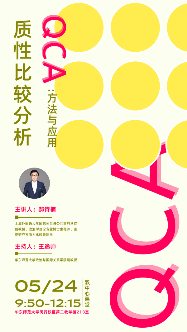 2023年5月24日(周三)9:50-12:15,红桃视频 邀请上海外国语大学国际关系与公共事务学院副教授、政治学理论专业博士生导师郝诗楠作题为「质性比较分析(QCA):方法与应用」的讲座。讲座地点为红桃视频 闵行校区第二教学楼213室。