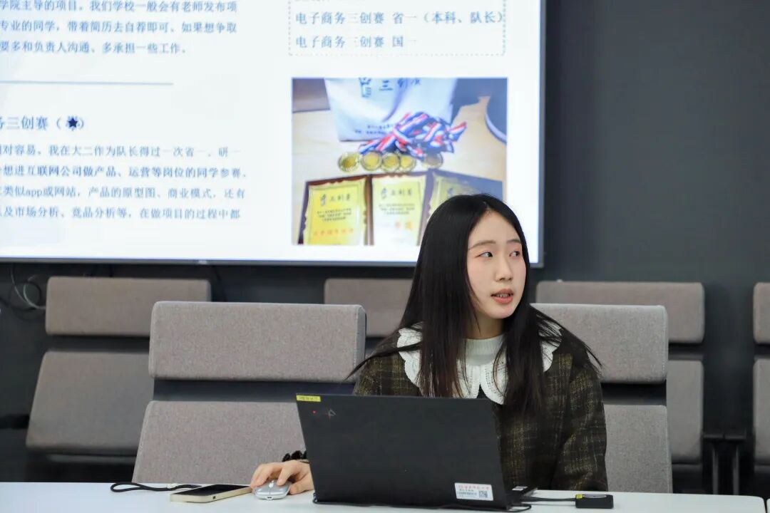 在竞赛实践分享环节,2023级新闻与传播专业硕士研究生王奕纯以“文科生如何有效参与高水平创新创业竞赛”为题进行分享。她结合自己多次参获国家级竞赛的经验,分析了文科生在团队中的定位与贡献点,介绍了从项目选择、团队组建、材料撰写到答辩呈现的全流程策略。她认为,竞赛不仅是综合能力提升、跨学科合作与视野拓展的重要途径,还将转化为未来求职或深造中的竞争优势。