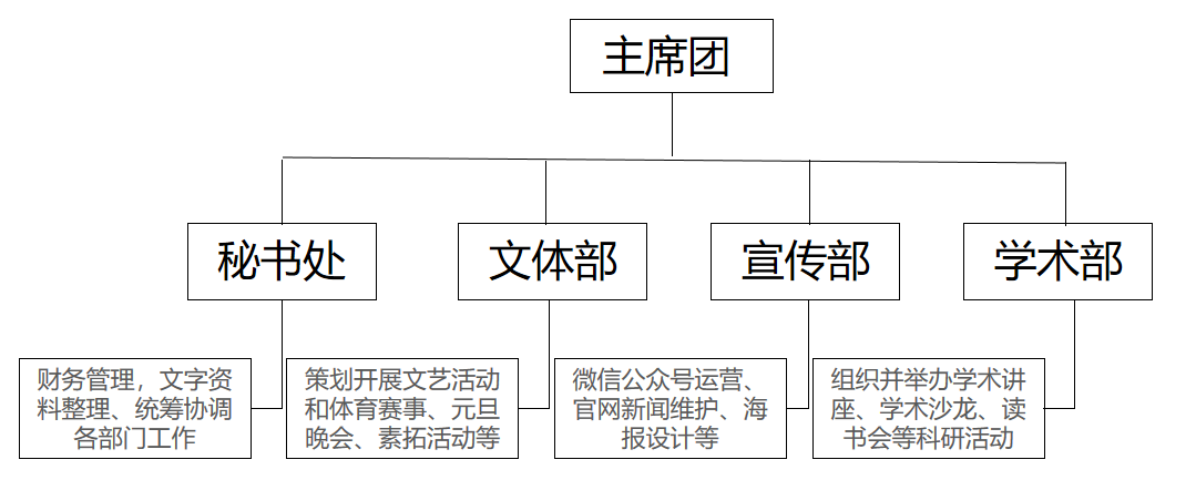 政治与国际关系学院研究生会是在学院党委领导、团委指导下的研究生骨干组织,始终秉承“上下贯通、协调有序、运转高效”的原则,以“主席团+四职能部门”为组织架构,致力于服务同学、促进学术、丰富文化、助力成长。我们不仅是学院与学生之间的桥梁,更是每一位研究生绽放才华、实现理想的重要平台。研究生会主席团目前设成员三人,四个职能部门分别为秘书处、文体部、宣传部和学术部。