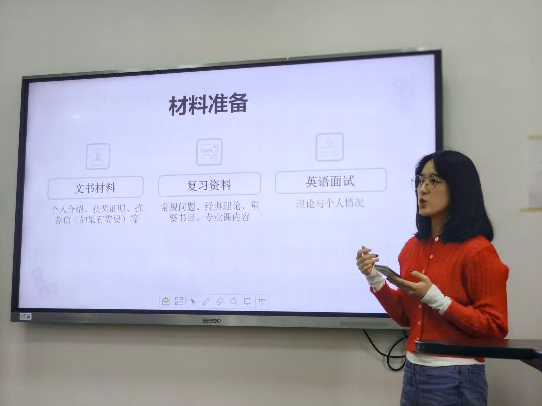 拟录取为我校思勉人文高等研究院中国古代文学专业硕士研究生的孟诗悦同学幽默风趣地为同学们介绍了如何进行跨专业保研。她建议同学们建立全局视角,与兴趣导向相结合,确定个人未来发展方向并持续挖掘个人兴趣。她分享了自己从大三开始准备保研的经历,激励同学们随时出发。同时她也强调要关注目标院校目标专业的招生要求,学会合理选择,如有留学交换等特殊经历,可以在资料中突出显示,展示个人特色。